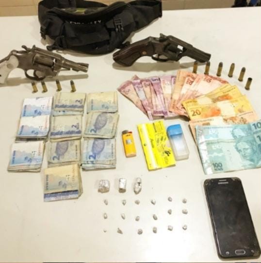 Com o mesmo ainda foi encontrado 18 pedras de crack. Ato contínuo, ao realizar a abordagem nos demais participantes da festa, o efetivo observou quando um jovem de 19 anos, se desfez de um objeto, prontamente foi realizada a busca no local, sendo encontrada outra arma de fogo, um revólver Taurus cal. 32 (numeração suprimida), com quatro munições, sendo uma pinada e três intactas.